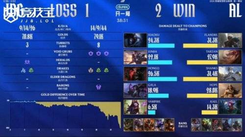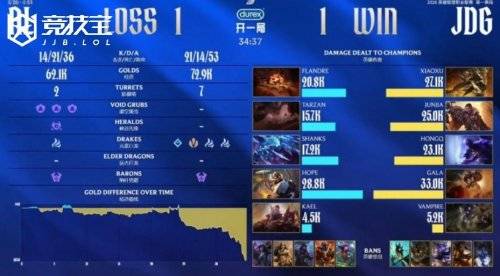 前期JunJia杰斯频繁照顾上路,配合Xiaoxu鳄鱼多次击杀Flandre纳尔。不过河道交锋中,Shanks冰鸟站了出来,连拿两个人头稳住局势,双方经济始终没有拉开。中期小龙争夺,Tarzan石头人反手大招撞飞两人,Hope飞机收获双杀,AL顺势控下大龙并打出1换2。随后一波中路拉扯中,GALA吉格斯回城途中,在盲视野下极限闪现躲开Tarzan隔墙大招,成为本局高光瞬间。比赛进入后期,JDG先拿下风龙魂并再度掌控大龙。正面团战中,Xiaoxu鳄鱼切入后排直接撕裂AL下路双人组,JDG把握机会一波推进,推平AL基地,将比分扳成 1-1。
