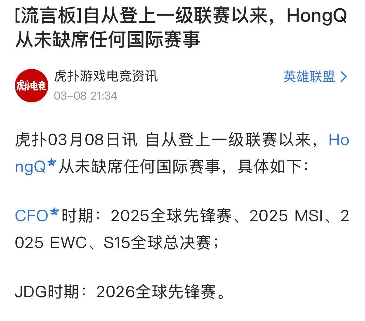 还有一个数据是非常亮眼的,就是hongq自从登上一级联赛以来,从未缺席过任何的国际赛事,之前在CFO战队的时候参加了S15赛季的全球先锋赛,msi,ewc以及全球总决赛。来到了jdg战队之后,又以lpl赛区2号种子的身份参加了S16赛季的全球先锋赛。如果没有太多意外的话,hongq大概率就是jdg战队的建队核心了,只要稳住现在的状态,基本上就可以成为lpl赛区前三的中单,除非这个队伍想要买下knight,否则的话不会有太多好的选择。
